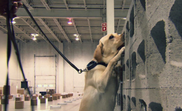 Что мы видим? Собака явно не на прогулке – она что-то делает, вероятнее всего, осуществляет поисковую деятельность. Исходя из фона, можно предположить, что идет проверка грузов/вещей, например, в аэропорту, на складе или другом подобном месте.